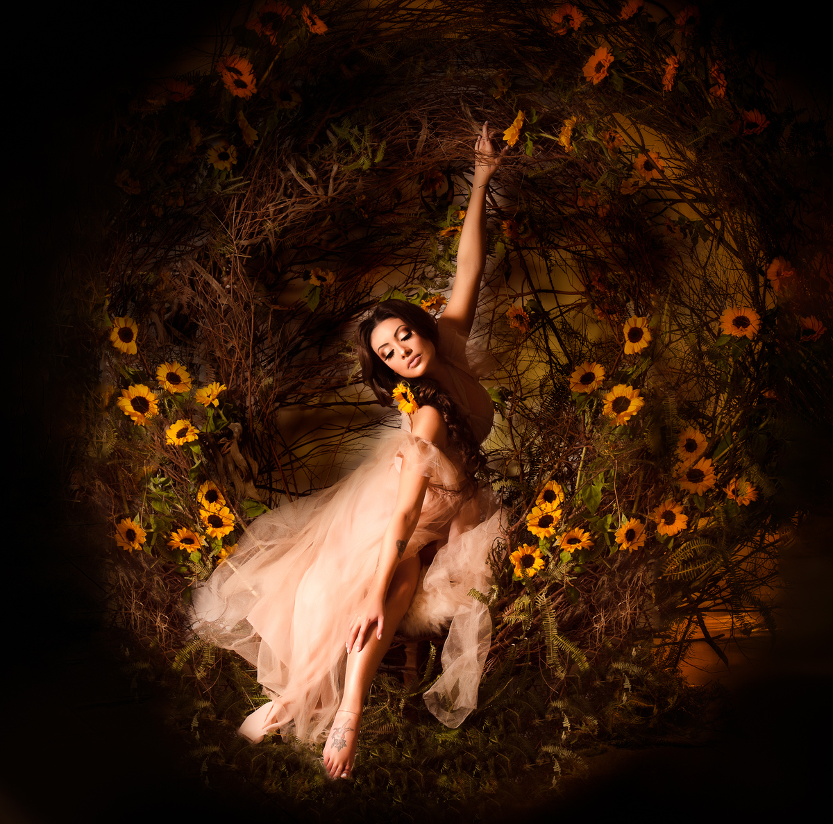 Este ensaio foi um processo de meses de criação, sempre buscando a essência do Girassol e a delicadeza da beleza feminina, ele retrata o nascimento, como se tivesse saído do ninho, envolto de girassóis e com a luz do amanhecer.